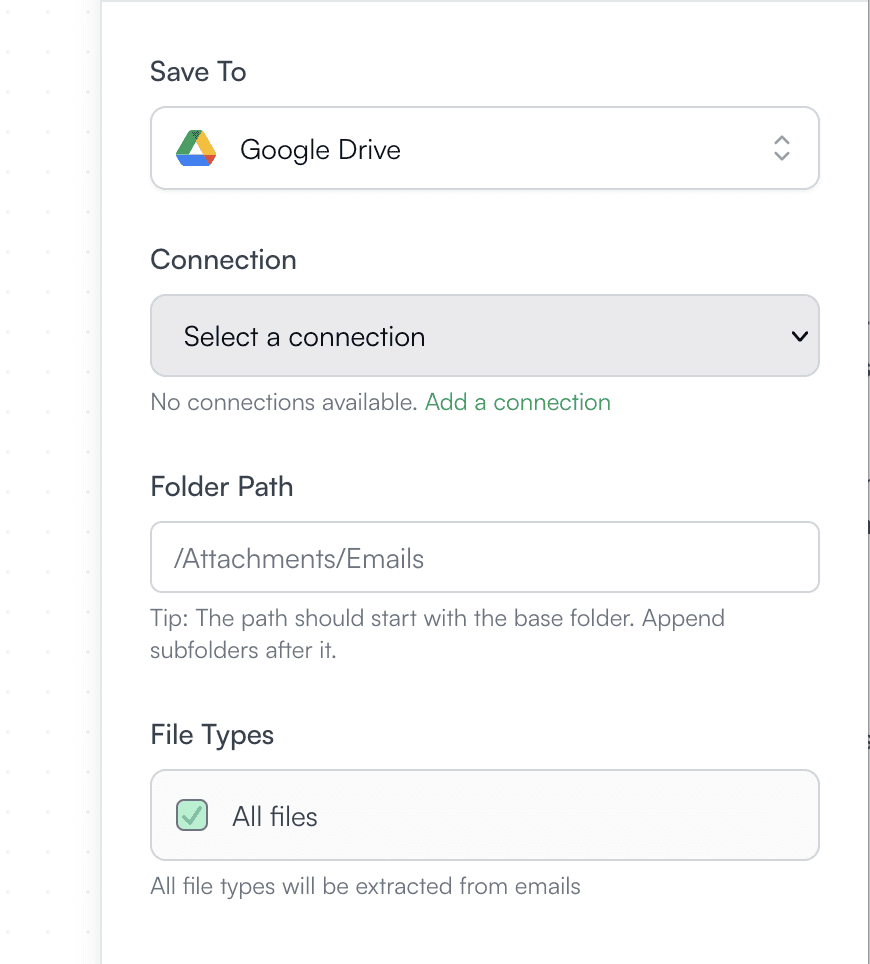 This workflow monitors your mailbox for new emails that match the search query you define. When a new email arrives that fits your criteria, Dioveo automatically collects its attachments and uploads them directly to the folder you choose in your cloud storage.