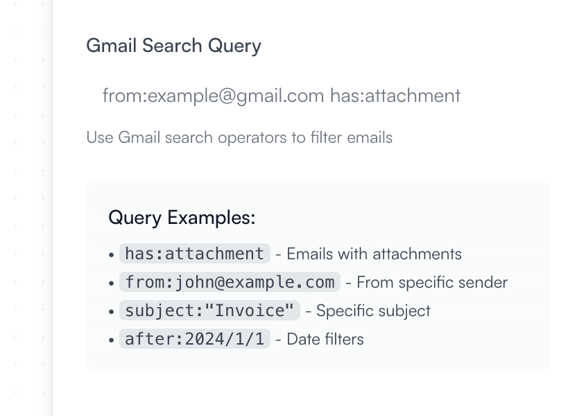 This query determines which new incoming emails the workflow will watch for.